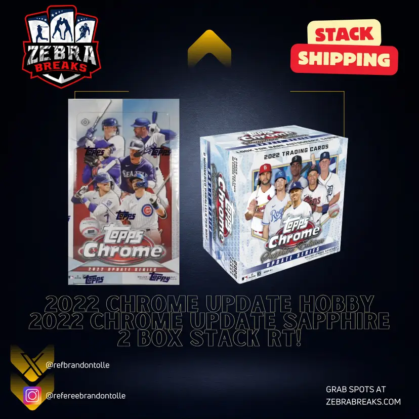 2022 Topps Chrome Update/1x 2022 Topps Chrome Update Sapphire STACK SHIPPING APPLIES All cards stack, you can request shipping by purchasing the "Stack Shipping Request" Item in the marketplace for Zebra Breaks specifically. Stack shipping is a $5 flat fee no matter how large your stack is. Shipping will occur the Friday/Saturday following your request if placed by Thursday night of the week you request shipping